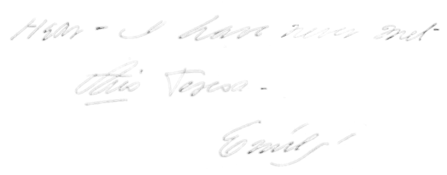Ażeby nie ukształtować tu poradnika do fałszowania zapisów, spróbujmy tylko sobie uświadomić, na co by nam przyszło się godzić, lekceważąc kryterium gdzie przynależy kształt litery T. Użyjmy „próbki” stylu pisma Emilii Dickinson w suchym markerze: „próbka” nie ma oszukać; ma zachęcać do otwartości umysłu. Hear – I have never met this Teresa – Emily.