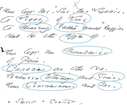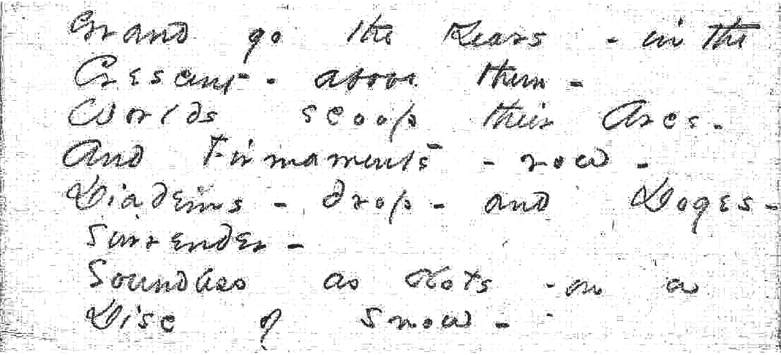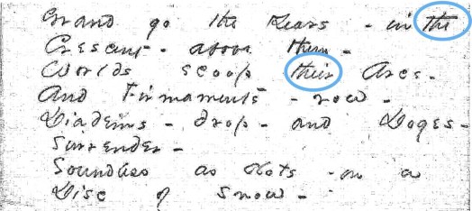 Nie jest możliwe, aby jakakolwiek transkrypcja tych fragmentów oddała istotne detale tego, jak Dickinson oryginalnie kładła swą poezję na papier. [5]