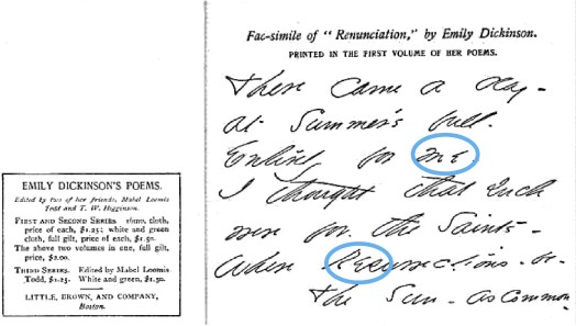 Wraz z kształtami jak εntirely, mε i rεsurrections, w rękopiśmiennym Wyrzeczeniu jak wydane przez Little, Brown i Spółka w 1891, oraz Edεn z Nocy Nieokiełznanych (Houghton, próbka numer 269 u Franklina), możemy myśleć o samogłoskach niskich i wysokich, w jakimś ogólnym konturze.