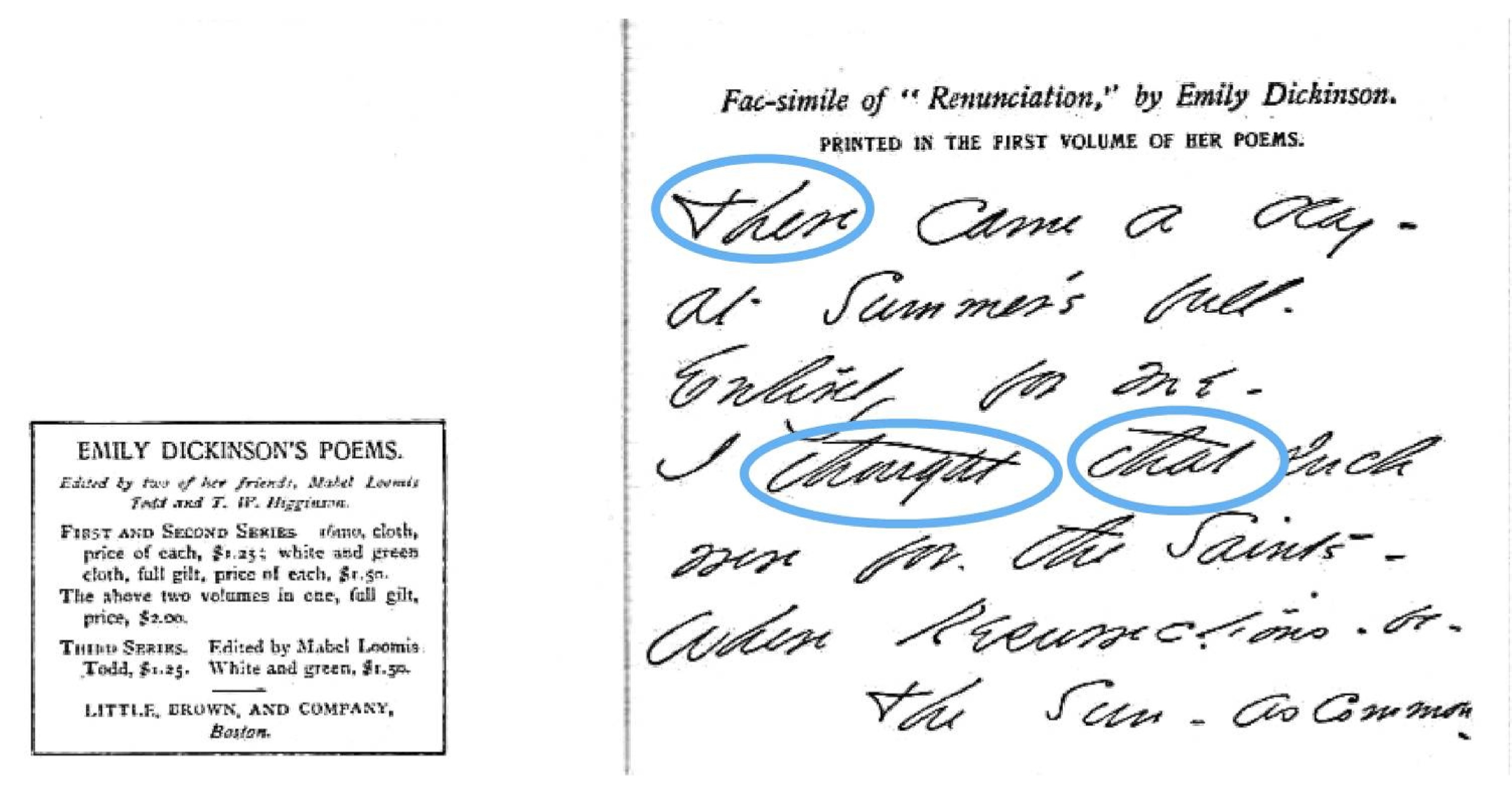 Tekst robi dozwolony użytek (fair use) ze standardowego prawa autorskiego, dla porównania fascykułów i druku: Thomas H. Johnson, 1955. The Poems of Emily Dickinson.