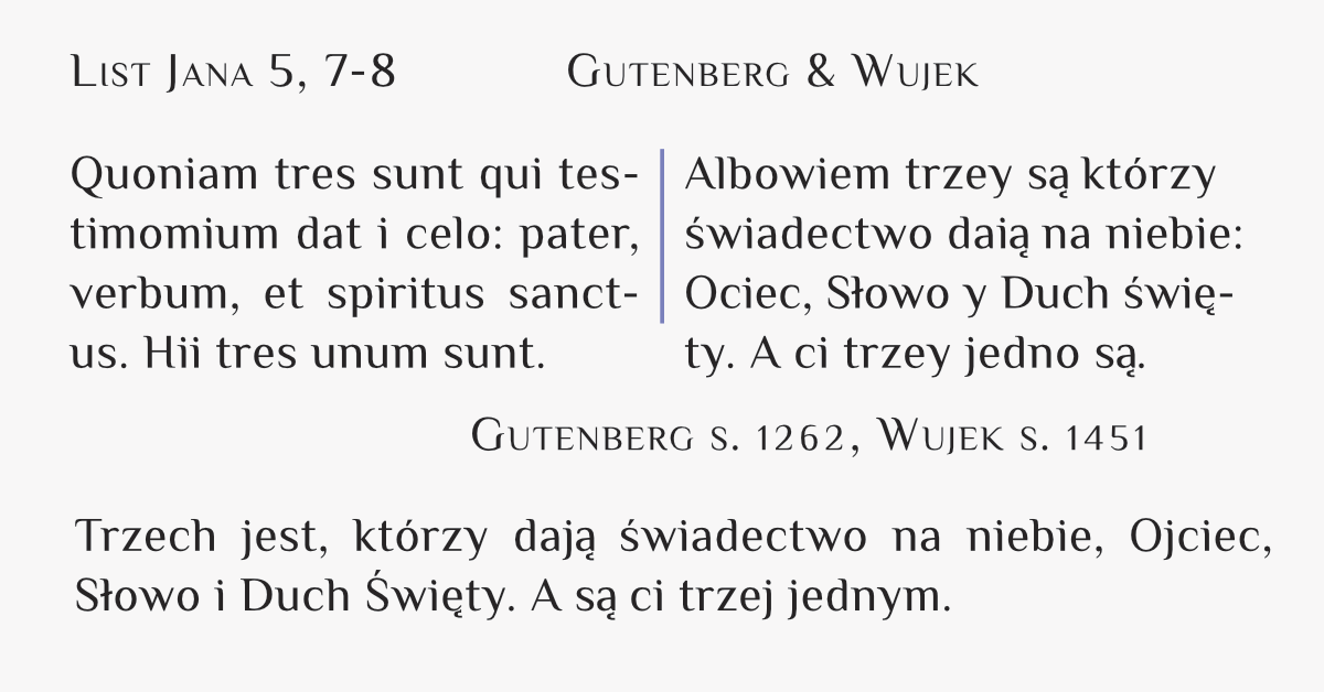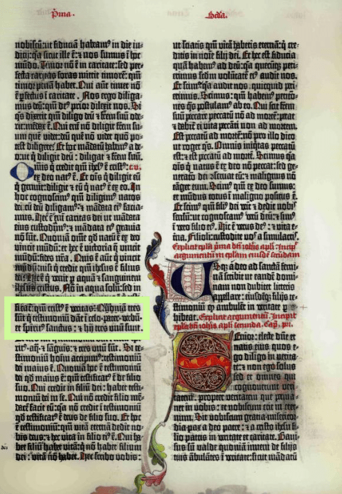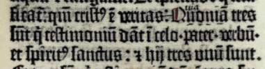 Quoniam tres sunt qui testimomium dat i celo: pater, verbum, et spiritus sanctus. Hii tres unum sunt. ■Gutenberg s. 1262.